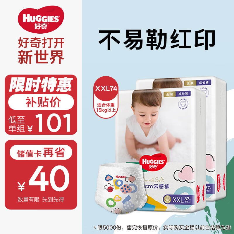 好奇(Huggies)金装成长裤XXL74(15kg以上)加加大号婴儿尿不湿超薄拉拉裤价格:101.00元!