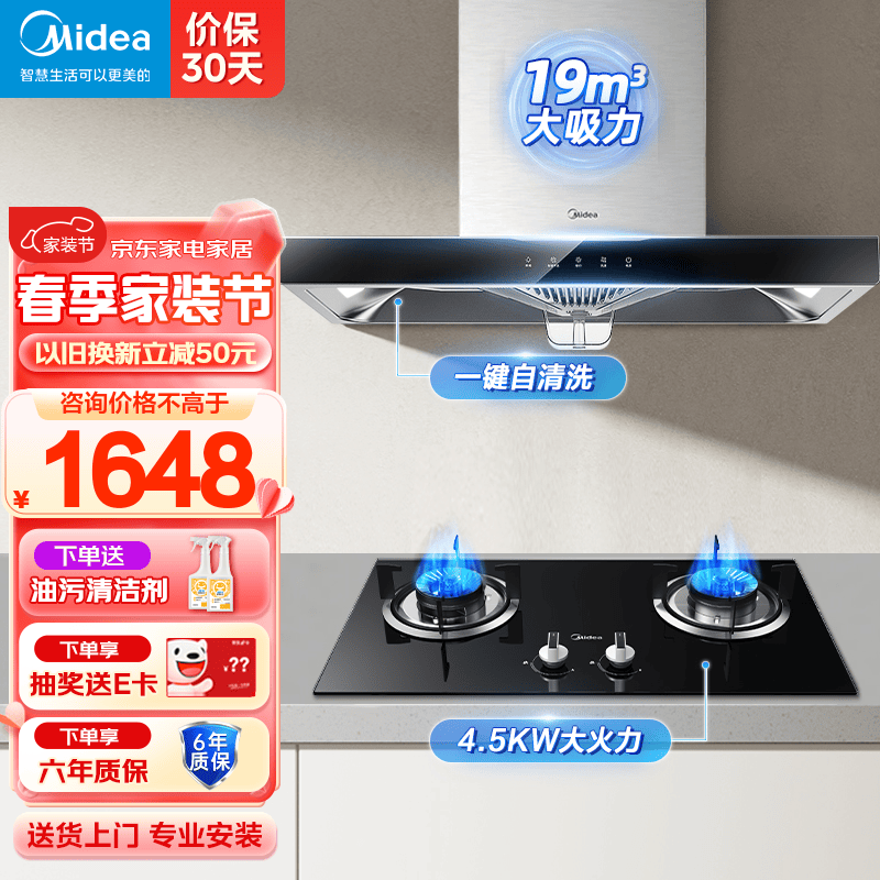 美的(Midea)抽油烟机家用爆炒19立方大吸力顶吸欧式吸油烟机T33A自清洗触控厨房出租房自清洁抽烟机脱排油烟机 【液化气】烟灶套装+4.5KW火力燃气灶 大风量排烟机价格:1748.00元!