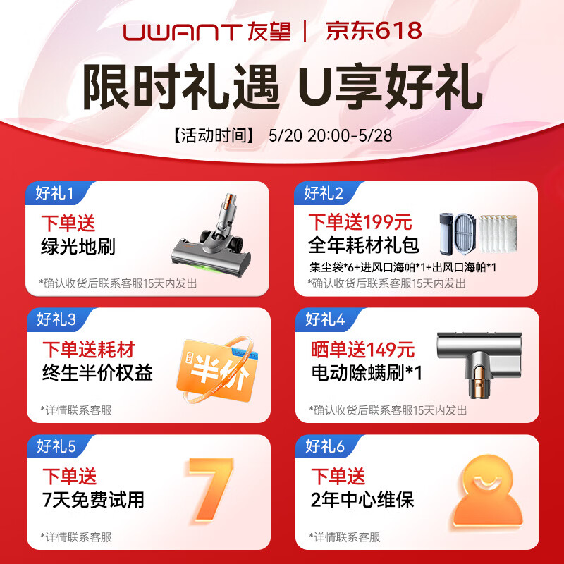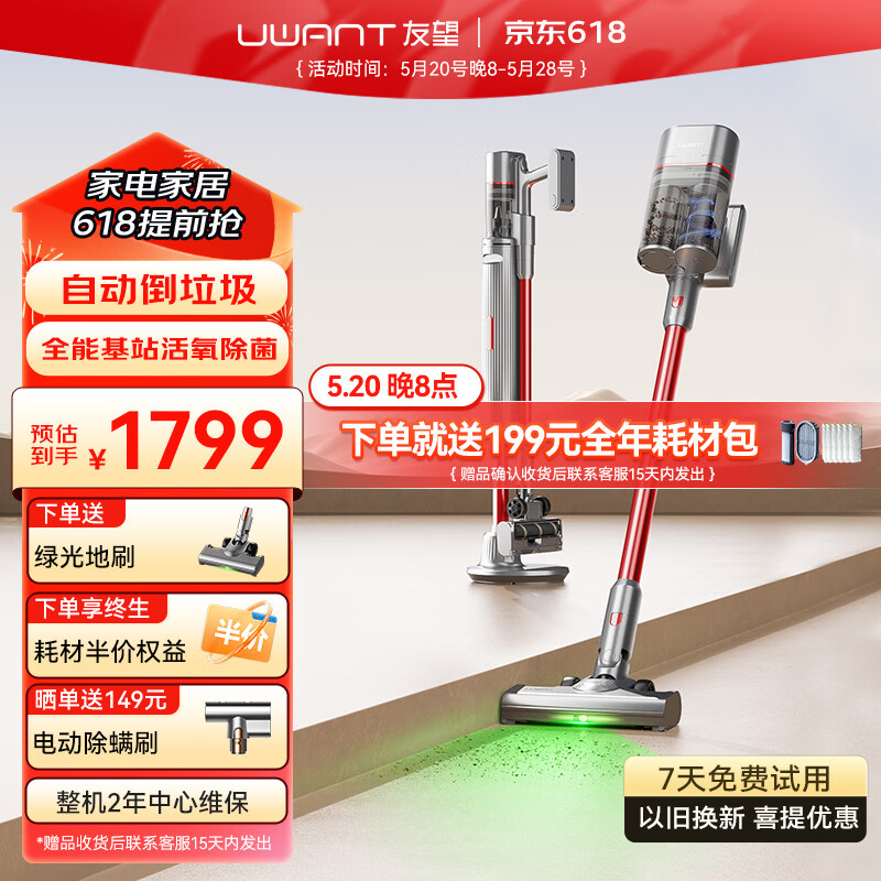 uwant友望吸尘器家用无线手持 智能自集尘基站 双尘杯毛发防缠绕 尘袋臭氧杀菌除味 60天免打理 K100价格:1999.00元!