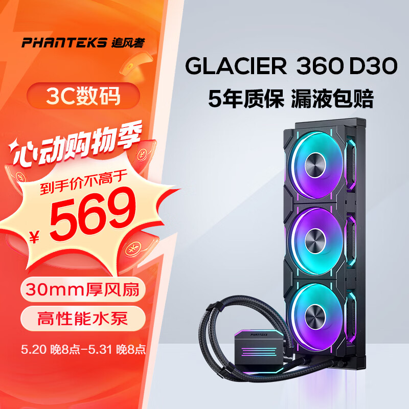 PHANTEKS追风者冰灵D30 360一体式CPU水冷散热器(30mm厚风扇/高性能水泵/支持14代CPU AM5/ARGB光效)价格:569.00元!