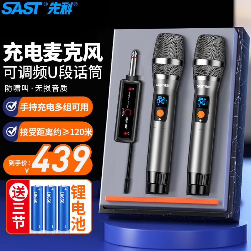 先科 OK-125 充电无线麦克风U段家庭KTV唱歌舞台主持演讲K歌会议音箱音响功放调频一拖二金属话筒价格:489.00元!