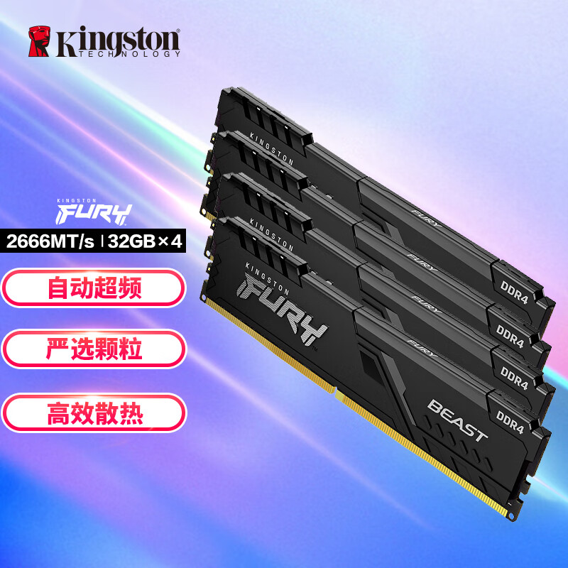 金士顿 (Kingston) FURY 128GB(32G×4)套装 DDR4 2666 台式机内存条 Beast野兽系列 骇客神条价格:2199.00元!