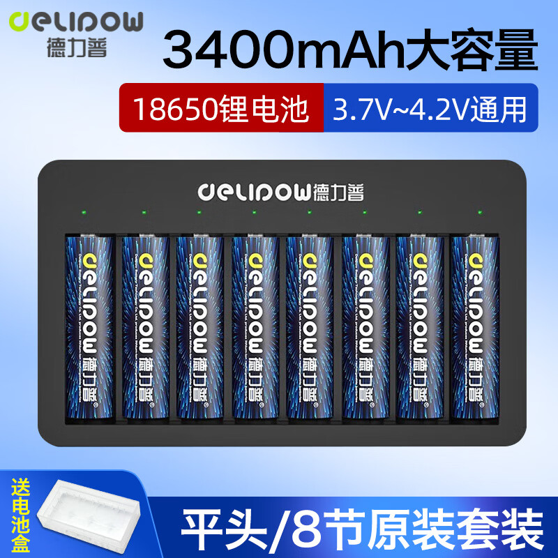 德力普(Delipow)18650锂电池大容量3400毫安强光手电筒专用电池充电器套装麦克风/头灯/航模/小风扇3.7V-4.2V通用价格:208.90元!