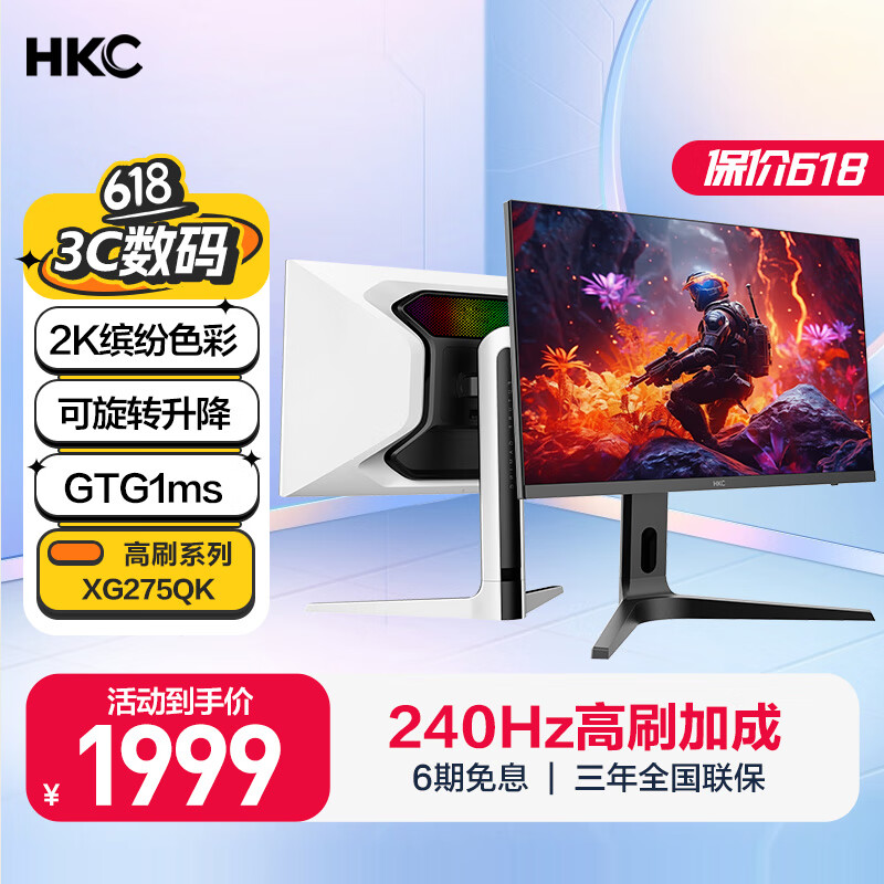 HKC 27英寸 FastIPS 2K 240Hz HDR400 1ms响应 广色域窄边框旋转升降电竞游戏网吧家用显示器 XG275QK价格:2299.00元!