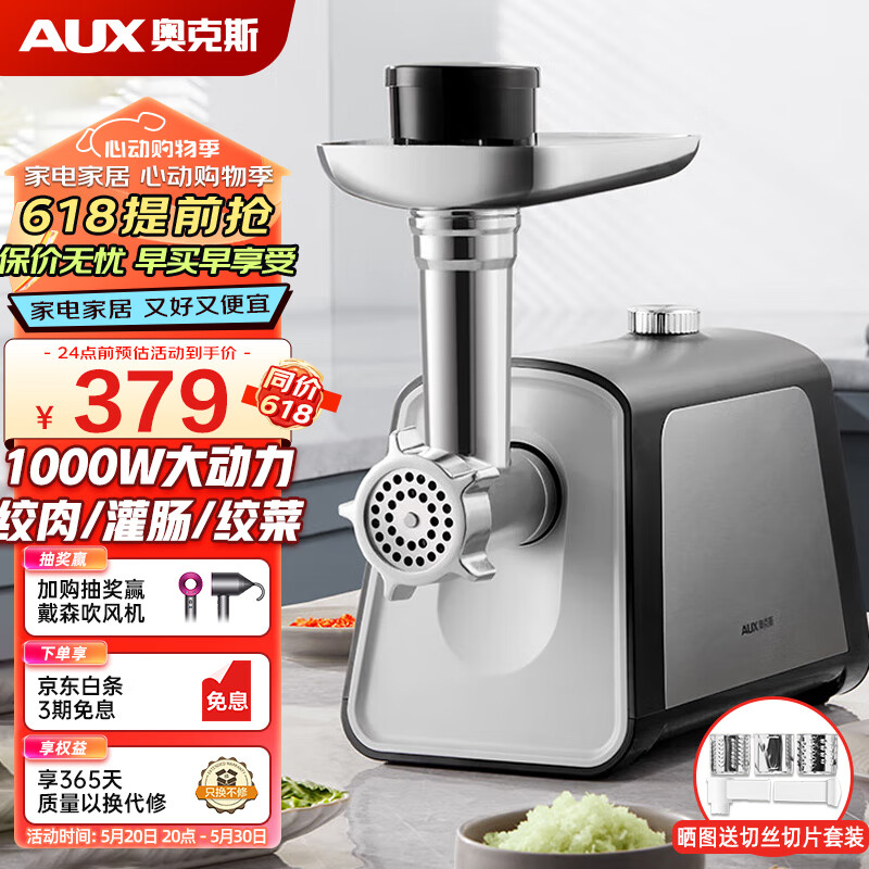 奥克斯(AUX) 绞肉机家用 灌肠机商用1000W大功率多功能电动不锈钢绞馅搅拌机碎肉碎蒜菜打肉馅机 HX-J358 不锈钢色价格:479.00元!