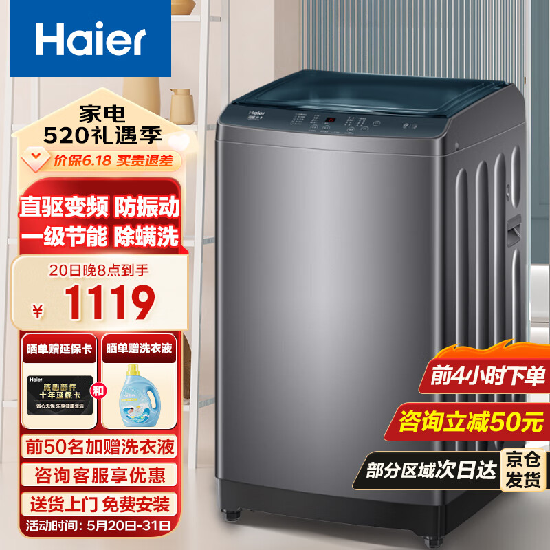 海尔(Haier)10KG波轮洗衣机全自动家用大容量直驱变频一级能效预约洗桶自洁+羊毛除螨洗脱一体XQB100-BZ506价格:1169.00元!