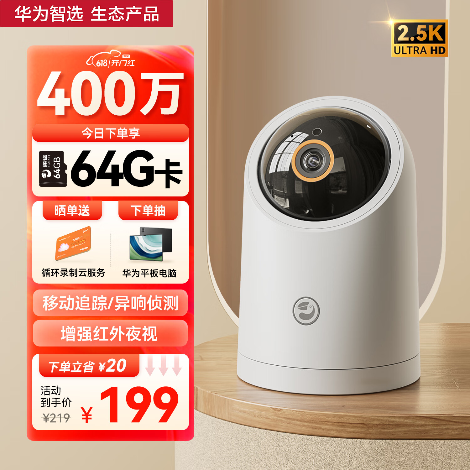 华为智选海雀400万摄像头监控器家用云台360度旋转无死角带夜视全景一键通话无线手机远程门口庭院室内看护价格:199.00元!