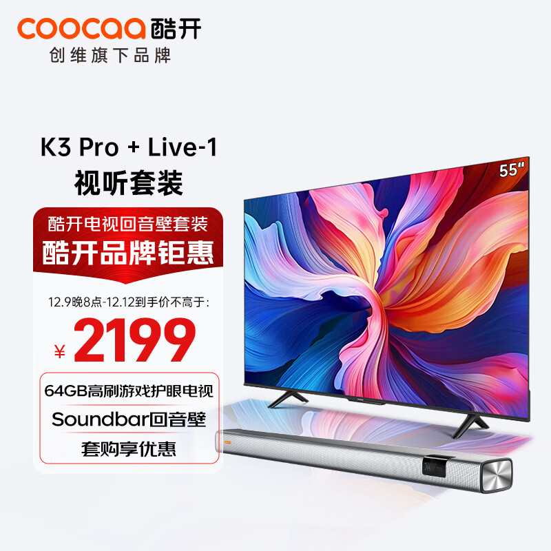 酷开创维 55英寸K3 Pro电视机+音响Live-1 回音壁 客厅家庭影院 壁挂条形音箱 蓝牙影院级娱乐体验套装价格:2199.00元!