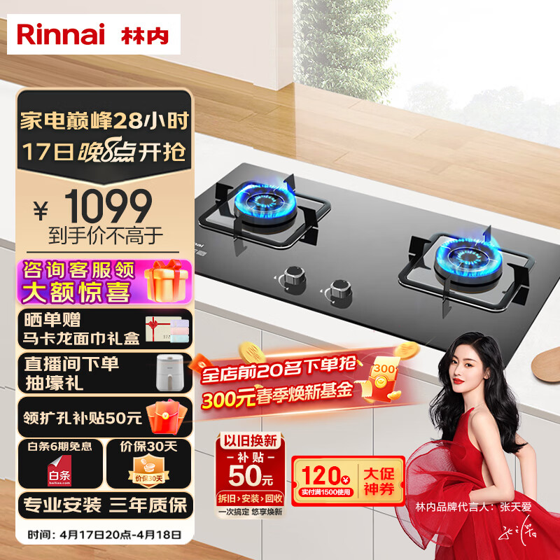 林内(Rinnai)燃气灶 天燃气灶双灶 嵌入式5KW超大火力猛火灶具 钢化玻璃 JZT-2E07M 天然气 一级能效价格:1098.00元!
