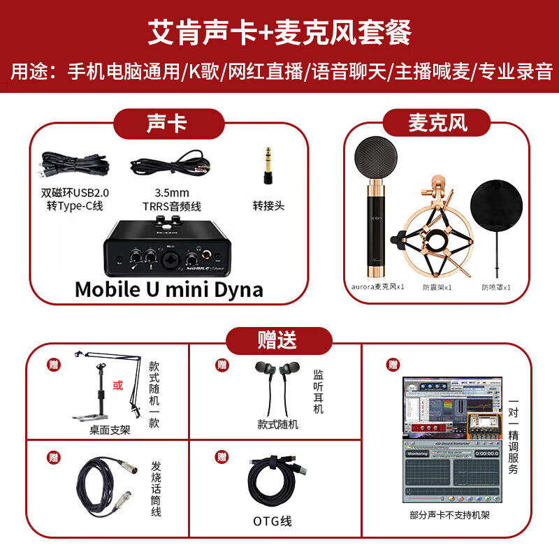 艾肯(iCON)mini外置声卡+aurora麦克风话筒套餐手机电脑喊麦唱歌录音主播直播设备 价格:2638.00元!