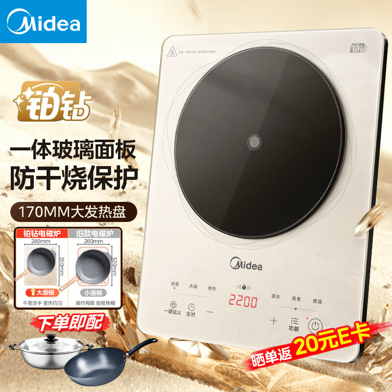 美的(Midea)电磁炉多档调节家用火锅炉 2200W大功率爆炒一体玻璃面板匀火加热 铂钻系列 23年新款超薄防水智能 配品质双锅 MC-E22B22A价格:339.00元!