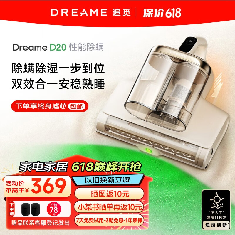 追觅除螨仪D20 家用手持除螨仪 床上吸尘器 去螨虫 强劲捶打 绿光显尘 双杯家用大吸力紫外线杀菌除湿价格:369.00元!