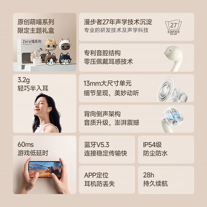 漫步者花再Zero 喵系列限定主题礼盒 真无线蓝牙耳机 半入耳式耳机 无线耳机 节日尊享定制礼盒 暹罗喵价格:179.00元!
