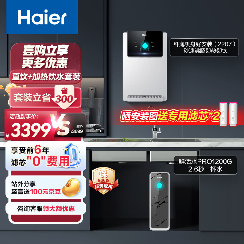 海尔(Haier)净水器1200G鲜活水 pro家用净水机6年RO反渗透3.48L/分钟净水器+管线机HKC3000-R793D2U1+R2207价格:3399.00元!