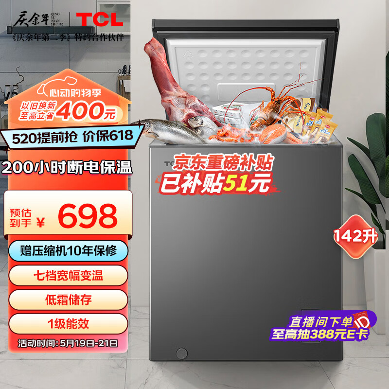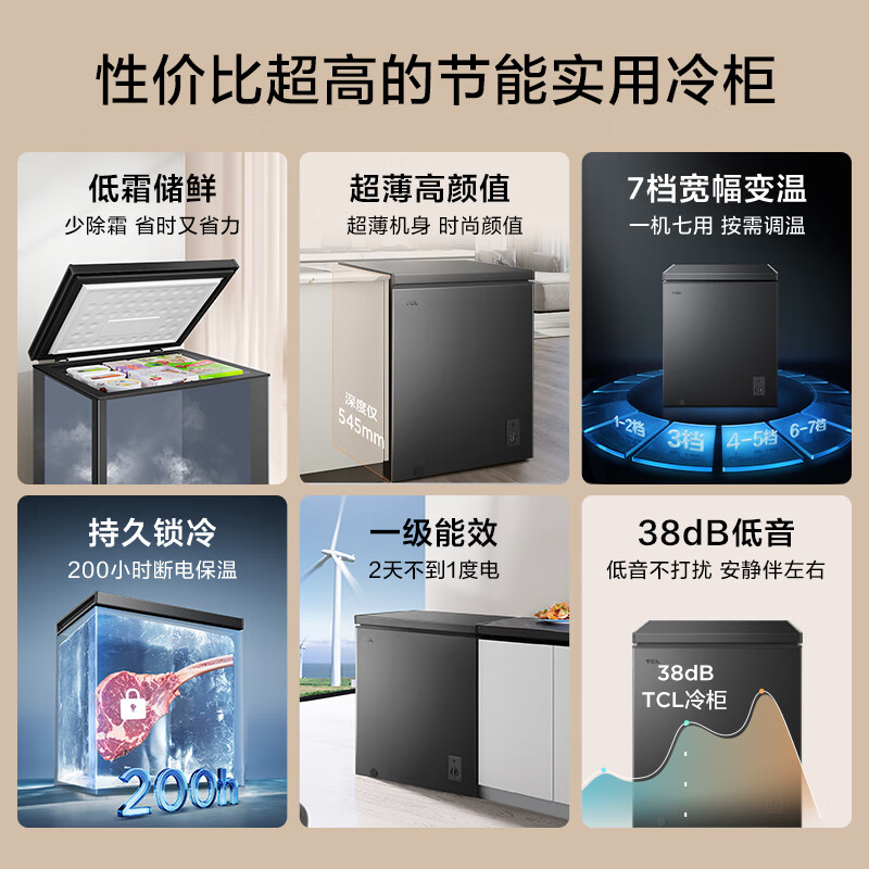 TCL 142升低霜节能冷柜一级能效小型冰柜38分贝宽幅变温顶开卧式家用冷藏冷冻转换BD/BC-142FQD价格:698.00元!