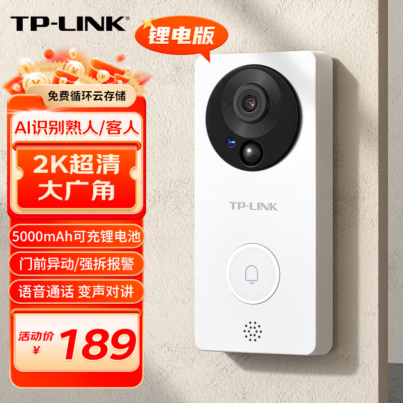 TP-link 可视门铃监控家用智能电子猫眼门口摄像头 无线wifi远程对讲300W超清夜视 DB52C 可充锂电池版价格:189.00元!