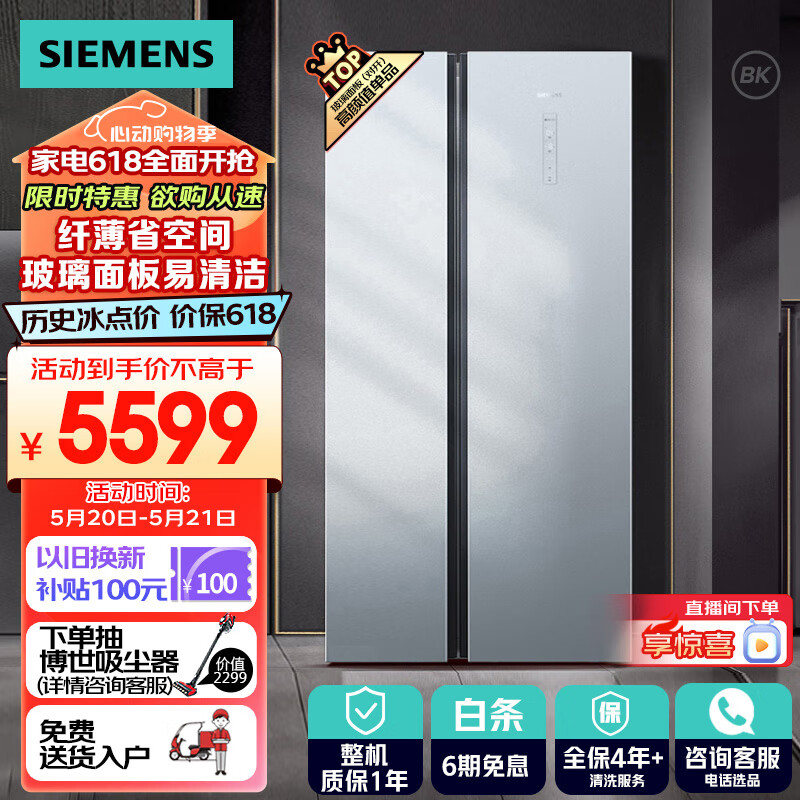 西门子(SIEMENS) 502升变频无霜对开双开门大容量家用冰箱超薄玻璃门晨雾灰以旧换新KA50SE43TI价格:6199.00元!