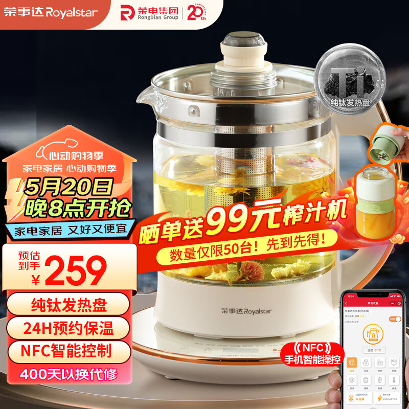 荣事达(Royalstar)养生壶 烧水壶煮茶器电热水壶2L纯钛加热盘抗异味恒温玻璃花茶壶电水壶【NFC蓝牙控制】YSH2002T价格:259.00元!