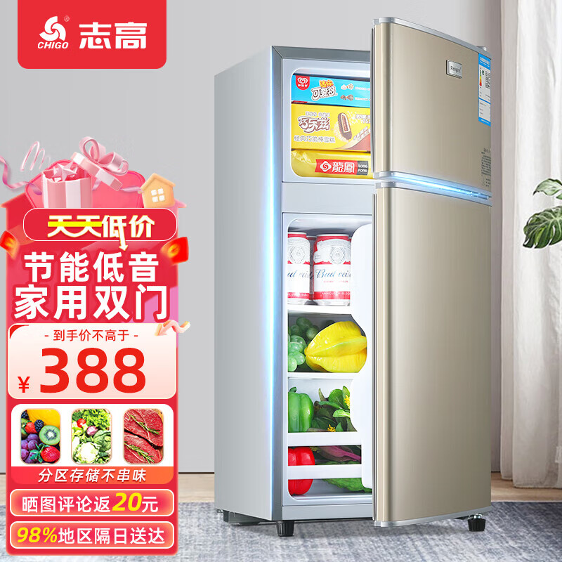 志高(CHIGO)小冰箱双门宿舍租房家用冷藏冷冻双开门迷你电冰箱节能保鲜小冰箱 BCD-43A128D金色价格:378.00元!