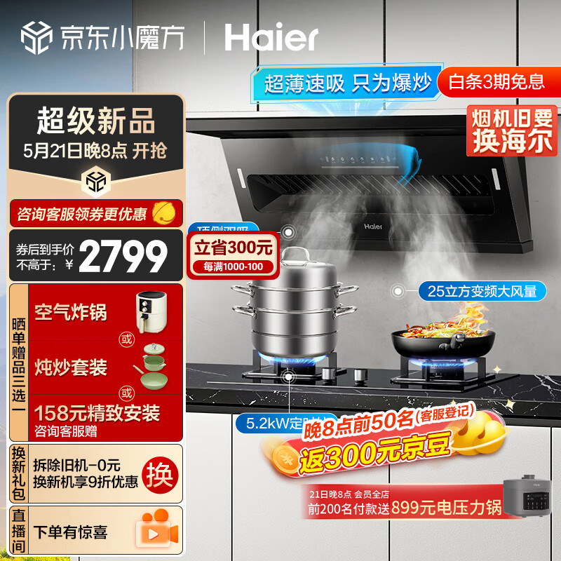 海尔(Haier)抽油烟机 顶侧双吸烟灶套装 变频25m3/min大吸力 5.2kw定时灶 家用油烟机燃气灶具套装C61+Q2BE7天价格:2999.00元!