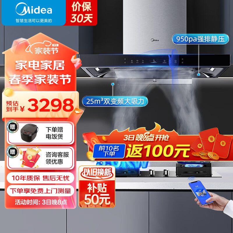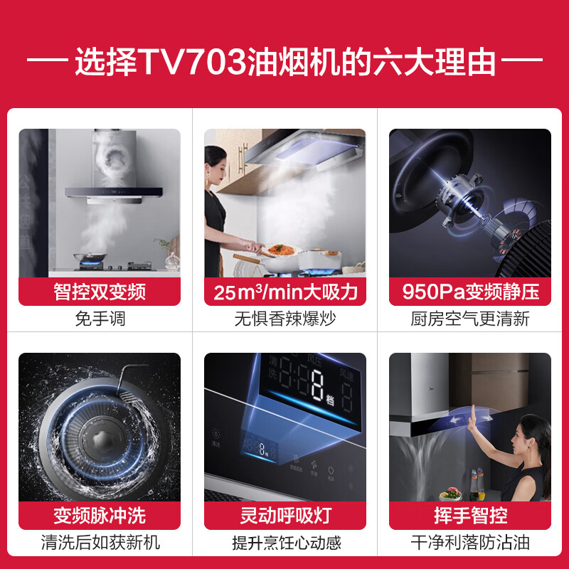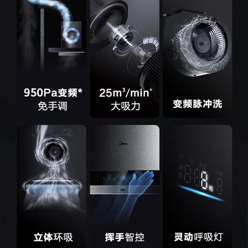 美的(Midea)抽油烟机欧式25立方大吸力双变频挥手智控脉冲自清洗吸油烟机燃气灶TV703+5.0kw定时灶套装[家电]价格:3298.00元!
