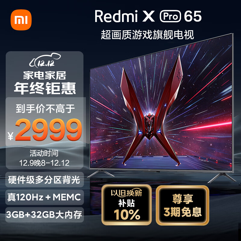 小米Redmi 游戏电视X Pro 65英寸电竞原色屏多分区背光 120Hz高刷 智能电视L65R9-XP 以旧换新价格:2999.00元!