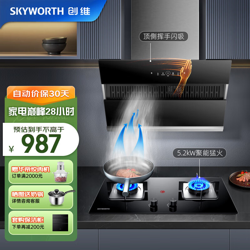 创维(Skyworth)抽吸油烟机灶具套装 侧吸式排油烟机燃气灶套餐烟灶700小尺寸家用自动清洗挥手Y101+Z50BS-1天然气价格:987.00元!