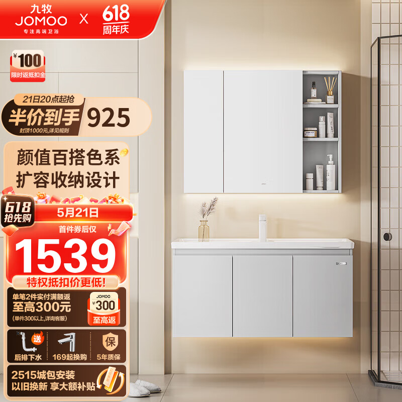 九牧(JOMOO)极简浴室柜陶瓷一体盆悬挂式洗脸洗手组合柜100cm A2721-17LD-1价格:2169.00元!