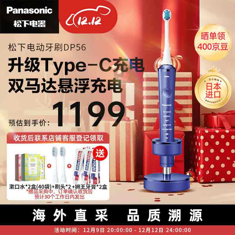松下(Panasonic) EW-DP56-A 进口电动牙刷 双重声波振动 成人五档刷牙模式 情侣款 蓝色价格:1699.00元!