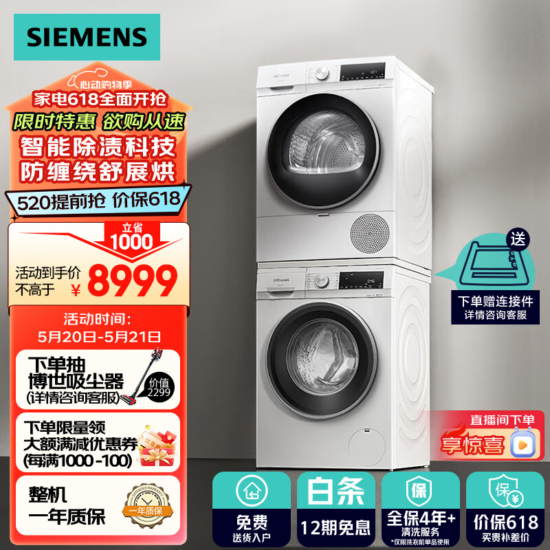 西门子(SIEMENS)iQ300 10+10kg洗烘套装 智能除渍除螨 热泵速烘 WG52A100AW+WQ55A2D00W价格:9999.00元!
