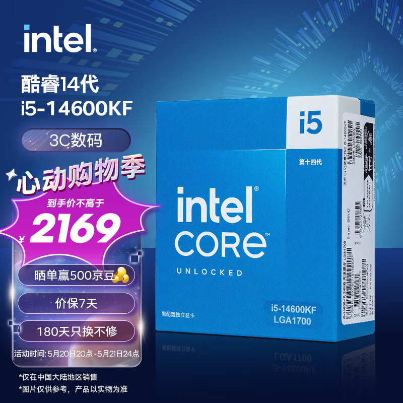 英特尔(Intel) i5-14600KF 酷睿14代 处理器 14核20线程 睿频至高可达5.3Ghz 24M三级缓存 台式机盒装CPU价格:2169.00元!