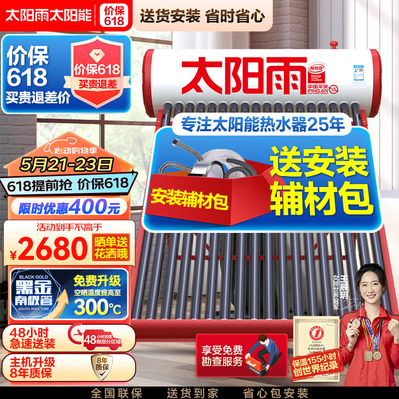 太阳雨 (Sunrain)太阳能热水器家用保热墙一级能效 A无电系列20管155L价格:3080.00元!