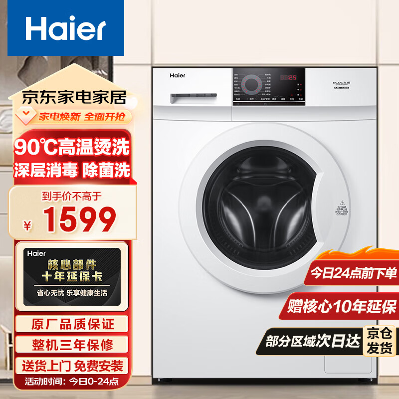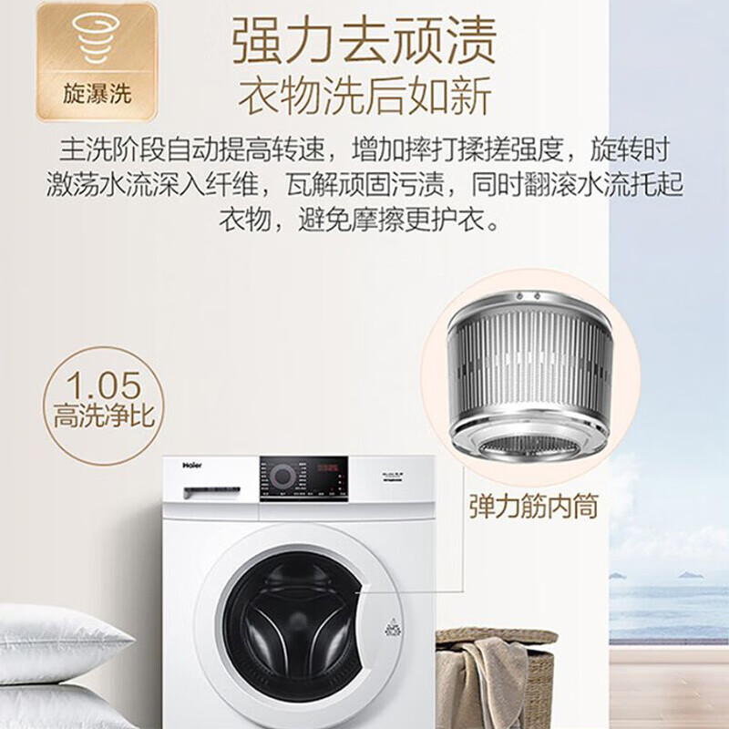 海尔(Haier)8KG滚筒洗衣机全自动家用大容量一级能效变频节能消毒杀菌洗高温筒自洁洗脱一体机EG80B08W价格:1599.00元!