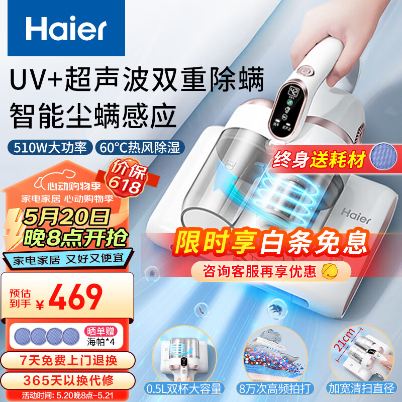海尔(Haier)除螨仪家用手持床上大吸力双杯智能除螨仪 超声波紫外线杀菌去螨虫 热风除湿 HZ-C9W价格:469.00元!