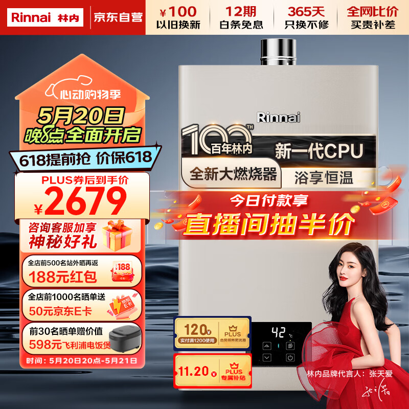 林内(Rinnai)【小蛮腰Pro】13升燃气热水器 全新智慧芯 恒温再升级 天然气热水器12T RUS-13GD32(JSQ26-GD32)价格:2799.00元!
