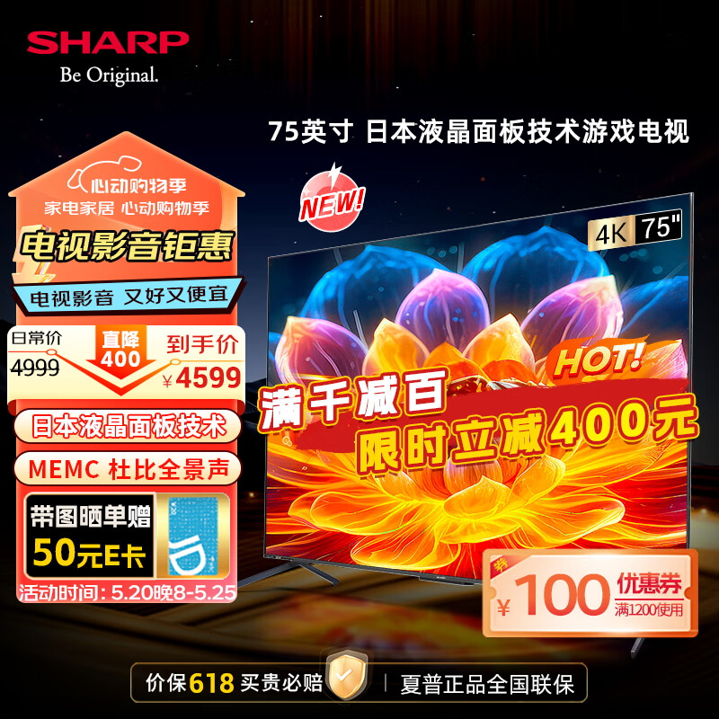 SHARP夏普电视75英寸3+32G HDMI2.1 MEMC 杜比全景声HDR10 4K超高清屏液晶平板电视4T-C75FL1A价格:4599.00元!