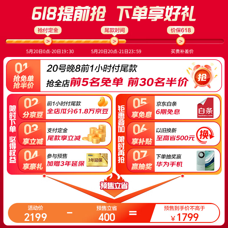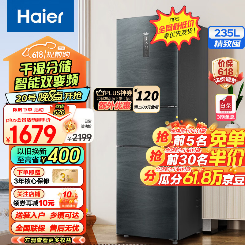 海尔(Haier)冰箱235升三开门风冷无霜 智能双变频一级能效 干湿分储 家用小型节能电冰箱价格:2199.00元!