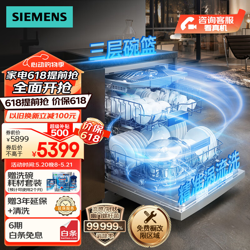 西门子16套大容量除菌消毒 独嵌两用全能舱洗碗机嵌入式 精准涡流洗 智能抽湿烘干 96h存储 SJ23HI88MC价格:5899.00元!
