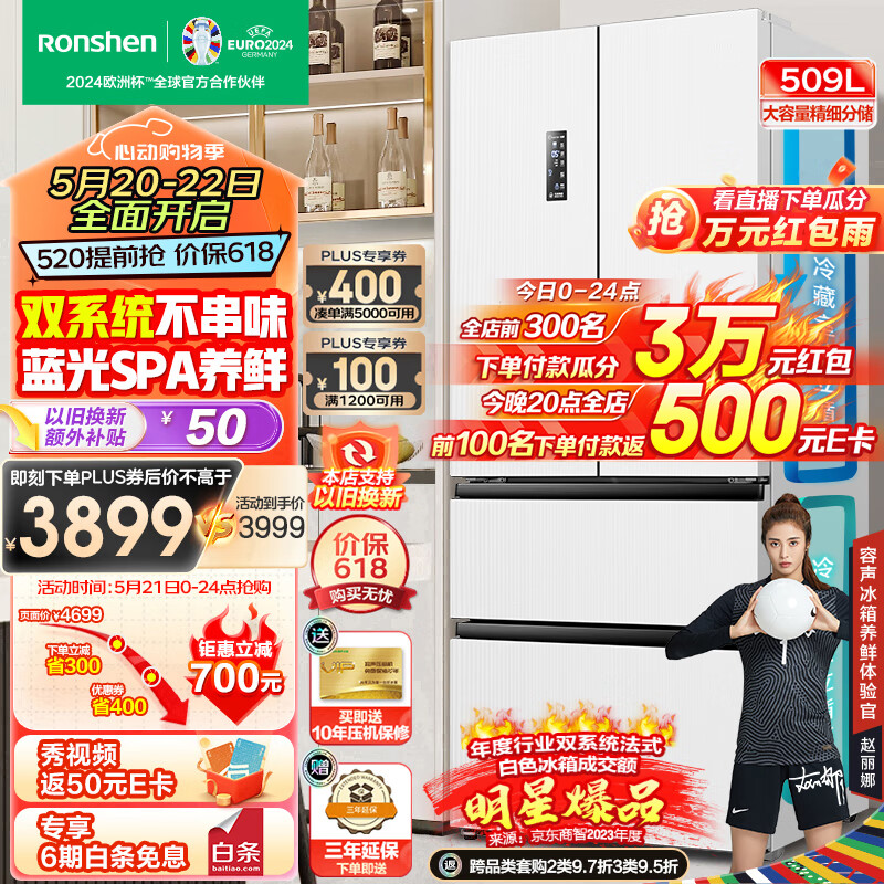 容声(Ronshen)蓝光养鲜509升变频一级能效法式多门四开门嵌入式冰箱白色家用无霜除菌BCD-509WD18MP双循环大容量价格:4699.00元!