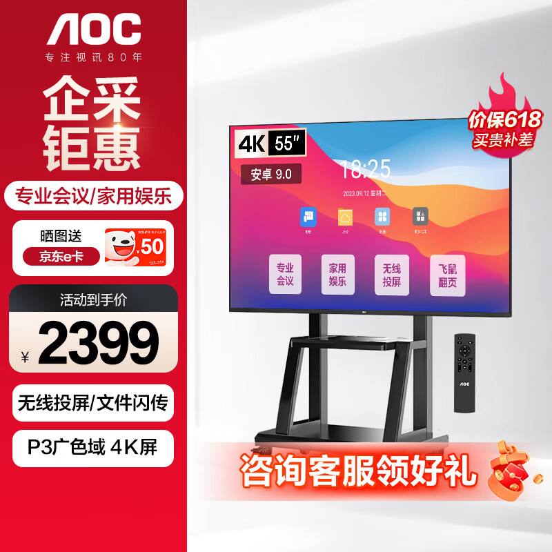 AOC会议电视4K超清会议平板一体机移动电视会议室显示屏投影投屏商用电视多媒体一体机智能显示智慧屏55英寸55NV+移动支架价格:2499.00元!