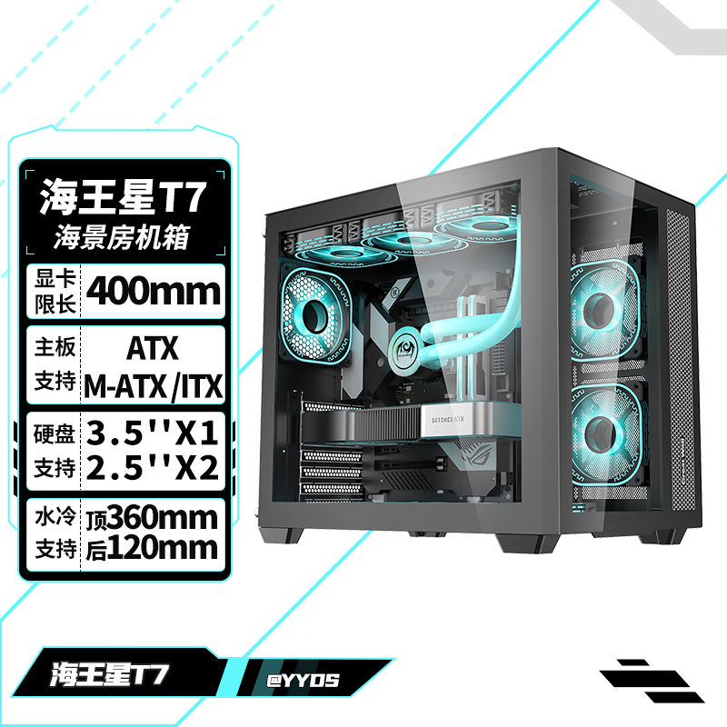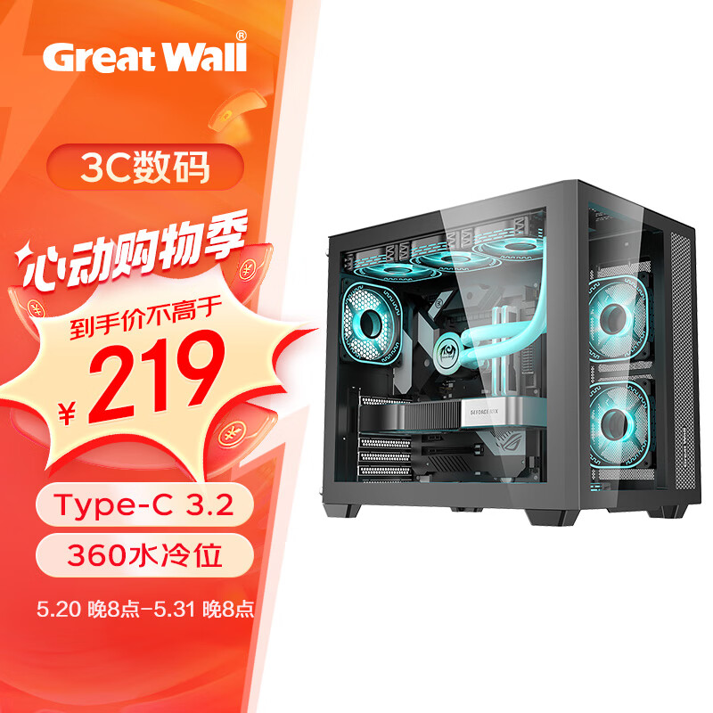 长城(Great Wall)海王星7黑色海景房机箱电商版(ATX主板/Type-C 3.2/360水冷位/玻璃侧透/9风扇位)价格:219.00元!