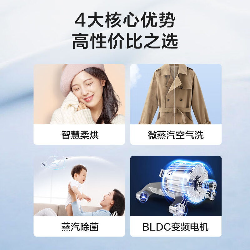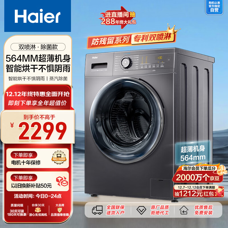 海尔(Haier)双喷淋滚筒洗衣机全自动 10公斤大容量 BLDC变频 超薄564mm 蒸汽除菌螨 洗烘一体机EG100HMATE35S价格:2299.00元!
