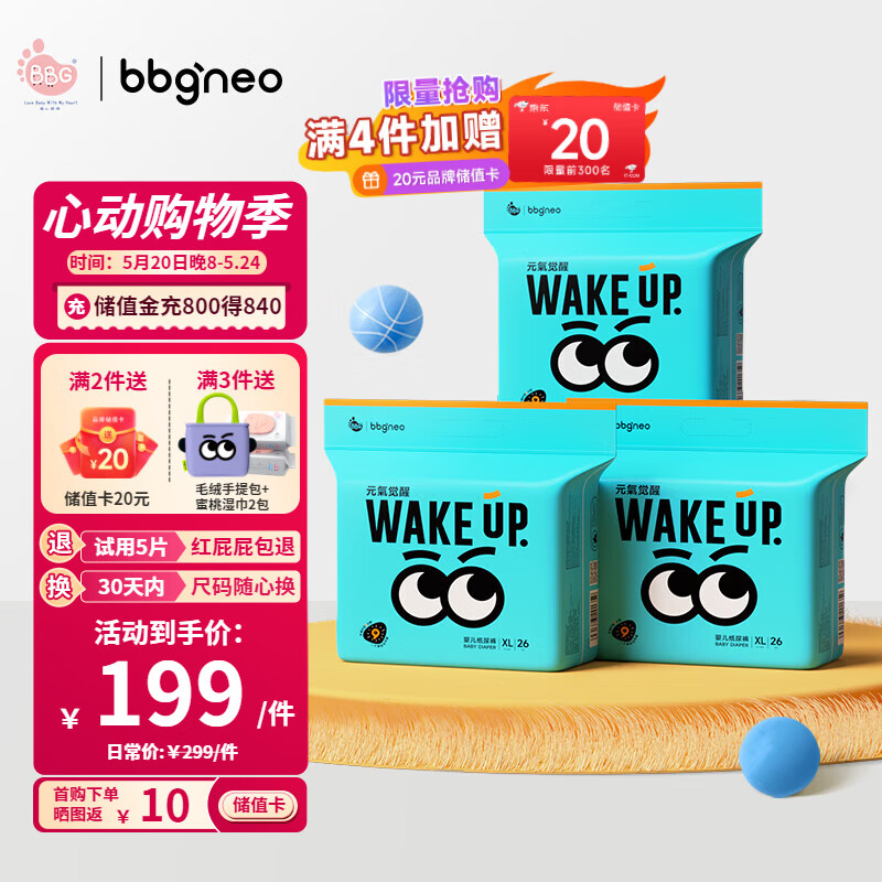 BBG元气觉醒neo系列纸尿裤XL码3包箱装78片(11-14kg)加大码尿不湿价格:219.00元!