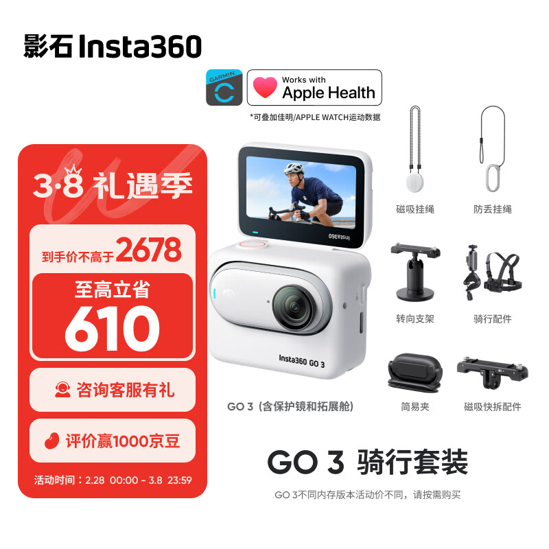 Insta360影石 GO 3拇指相机 运动亲子Vlog骑行宠物防水防抖运动相机(骑行套装 灵动白128G版)价格:2678.00元!