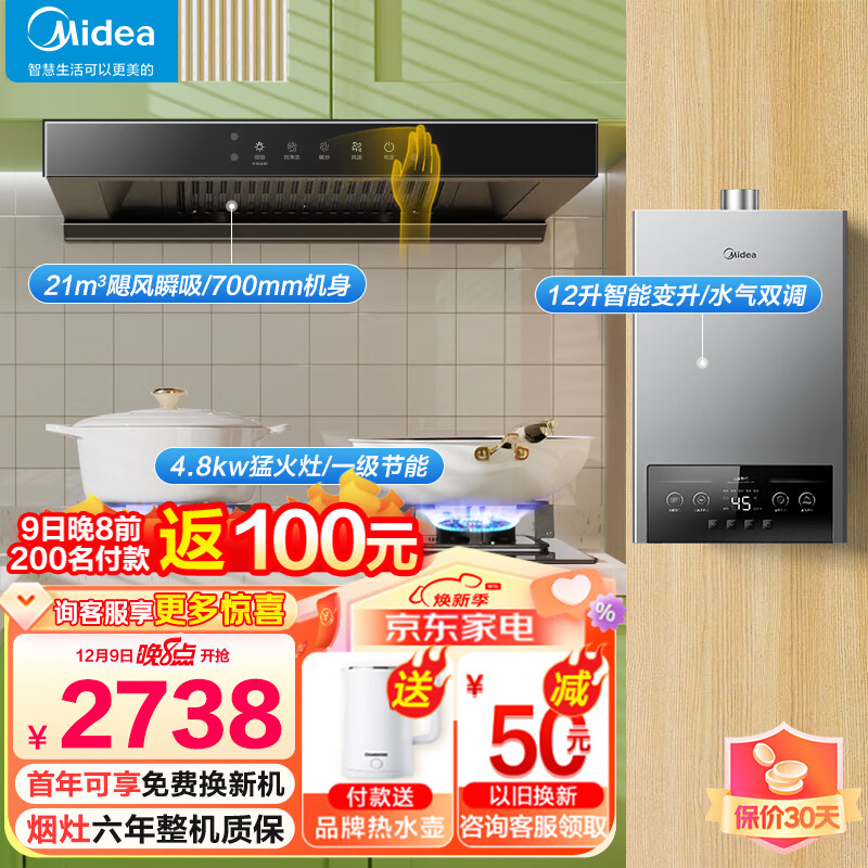 美的(Midea)小尺寸抽油烟机顶吸21立方大吸力油烟机燃气灶具热水器厨房电器三件套天然气以旧换新202+217+MK1价格:2738.00元!