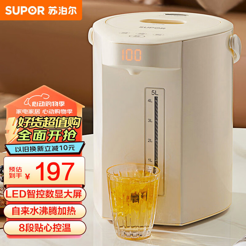 苏泊尔(SUPOR) 电热水瓶热水壶 5L大容量电水瓶八段智能保温恒温304不锈钢 家用电水壶烧水壶SW-50T106价格:197.00元!