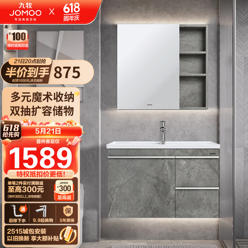 九牧(JOMOO)浴室柜 抗菌陶瓷一体盆仿岩板双抽拉组合马其灰80cm A2704-114W-1价格:2049.00元!