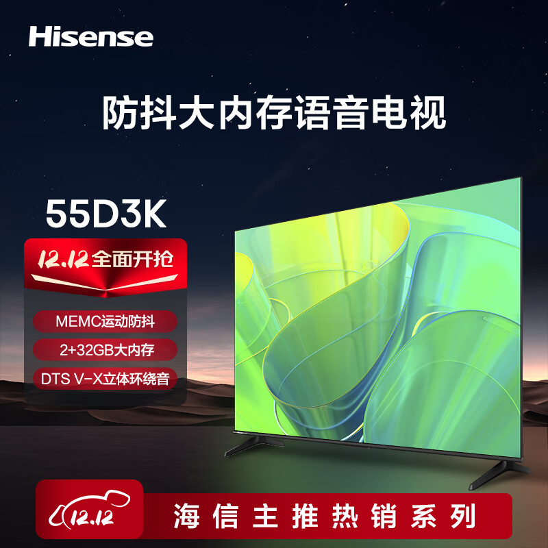 海信电视 55D3K 55英寸 MEMC运动防抖 2+32GB 语音智控 U画质引擎 AI智能内容感知价格:3999.00元!