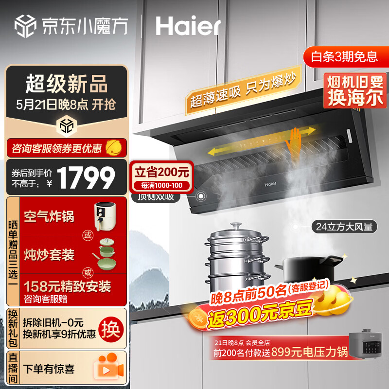 海尔(Haier)抽油烟机 顶侧双吸 7字型家用排烟机 24m3/min大吸力 齐平橱柜 挥手智控 自动清洗排吸烟机C51价格:1899.00元!
