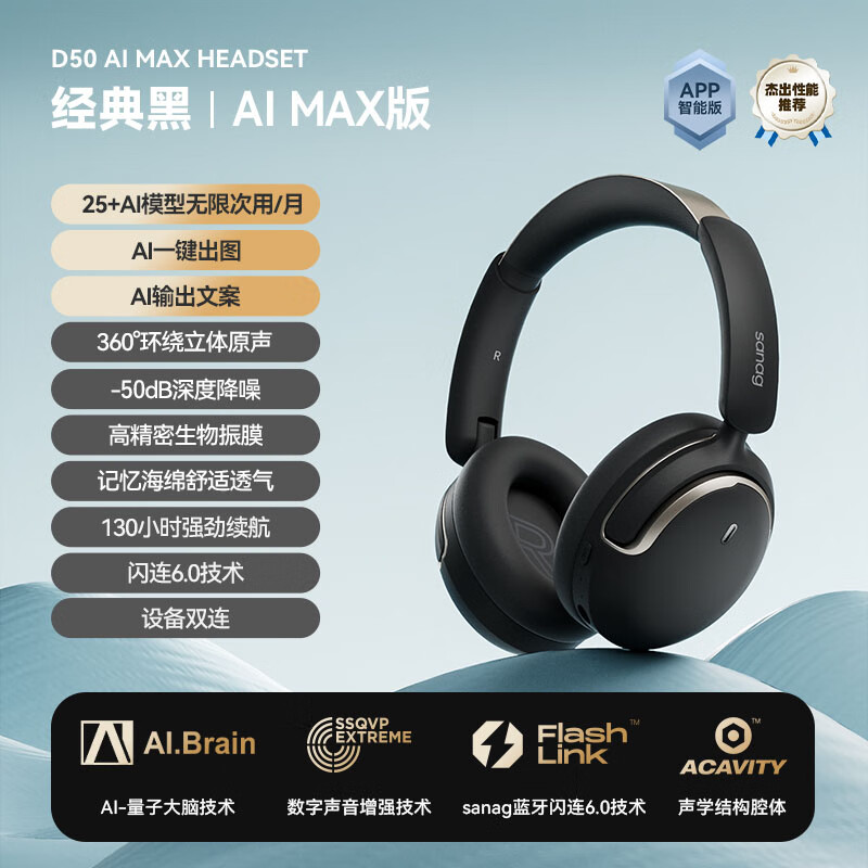 SANAG塞那 D50AI MAX头戴式蓝牙耳机【智能工作助手】主动降噪音乐耳机 全包式游戏耳机适用苹果华为黑价格:499.00元!